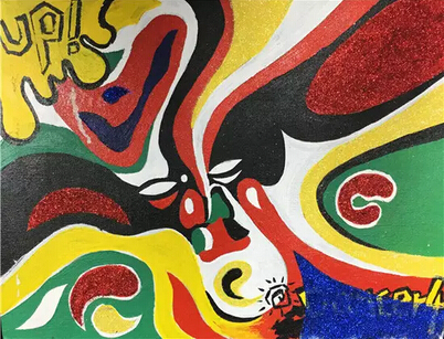 《話臉譜》是由我國傳統戲劇臉譜為基礎,經過線條、色塊的變形,表現出更為夸張的臉部表情。整體色彩鮮明,對比強烈,亮晶晶的粉末裝飾成為點睛之筆,使傳統的京劇臉譜變得更加鮮活、閃亮。