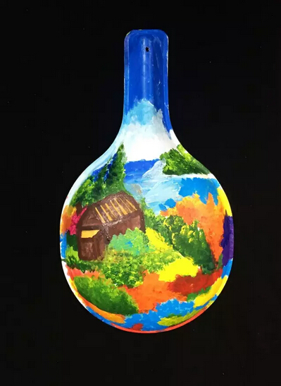 馬勺丙烯畫。在馬勺上,用丙烯顏料畫出房子前的大海,以及周邊的花叢。