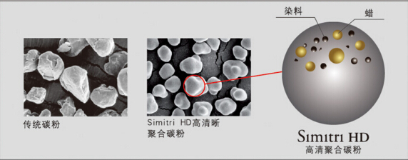 擁有700項專利的Simitri HD高清晰聚合碳粉,直徑僅6.5μm,遠遠小于直徑為8μm的普通研磨碳粉,所以可以產生更細、更一致的線條和更小的半色調點,而且生產出的高清晰度文本不會產生色彩的波動,尤其在普通復印時表現力度更為出色,可獲得生動色彩接近于鹵化銀的原稿照片。