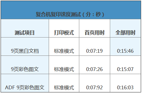我們也測試了雙面打印速度,換算得到為60.5ppm,有略微的下降,不過仍然是很快的速度。柯尼卡美能達(dá)C658復(fù)印性能1頁到9頁換算得到為63.9ppm,也與標(biāo)稱值65ppm的復(fù)印速度接近。用ADF復(fù)印9頁彩色圖文,換算得到速度為59.4ppm,僅有略微下降,仍然是很出色的性能。