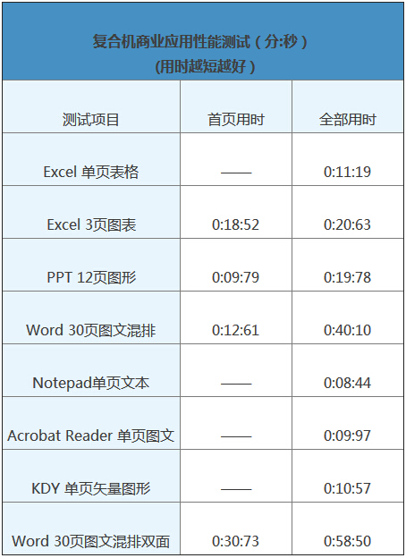 來看柯尼卡美能達(dá)復(fù)印機(jī)bizhubC658的輸出性能實(shí)測結(jié)果。單頁文件打印用時10秒左右,這還包括文件經(jīng)過印后處理組件的時間,非常快。而多頁Word、Excel和PPT文件打印速度換算得到為64.7ppm、62.5ppm和66.1ppm在標(biāo)稱值65ppm附近非常接近,有很高的打印性能。